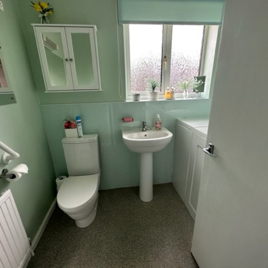 Seated disabled bath with shower unit. Pedestal wash hand basin with mixer tap. Low level WC. Radiator. Sealed double glazed windows to rear.