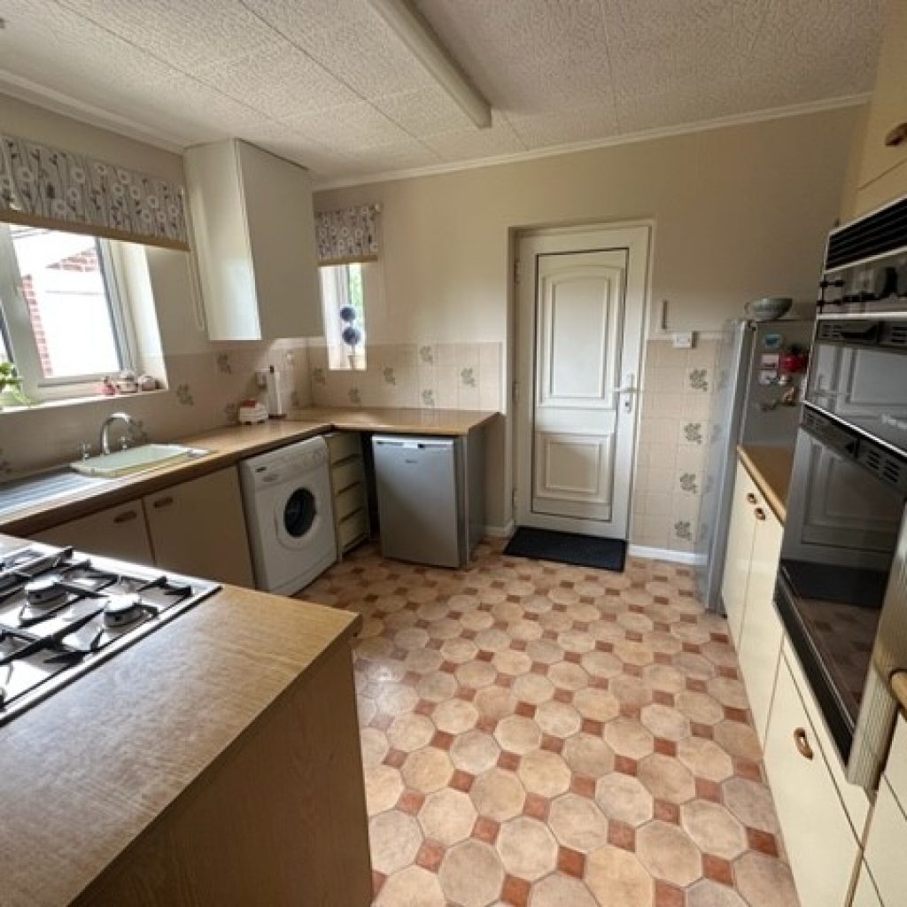 Laminate faced units with rolled edge worktops comprising single drainer stainless steel sink unit with mixer tap set in worktop with fitted cupboards under. Appliance space with plumbing for washing machine. Further work surface with four ring gas hob inset with built in cupboards under. Double built in oven. Further base and eye level wall units. Radiator. Power points. Sealed double glazed windows to rear.