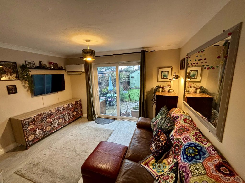 Sealed double glazed patio doors to rear garden. Laminate flooring. Power points. Access to storage cupboard under stairs.