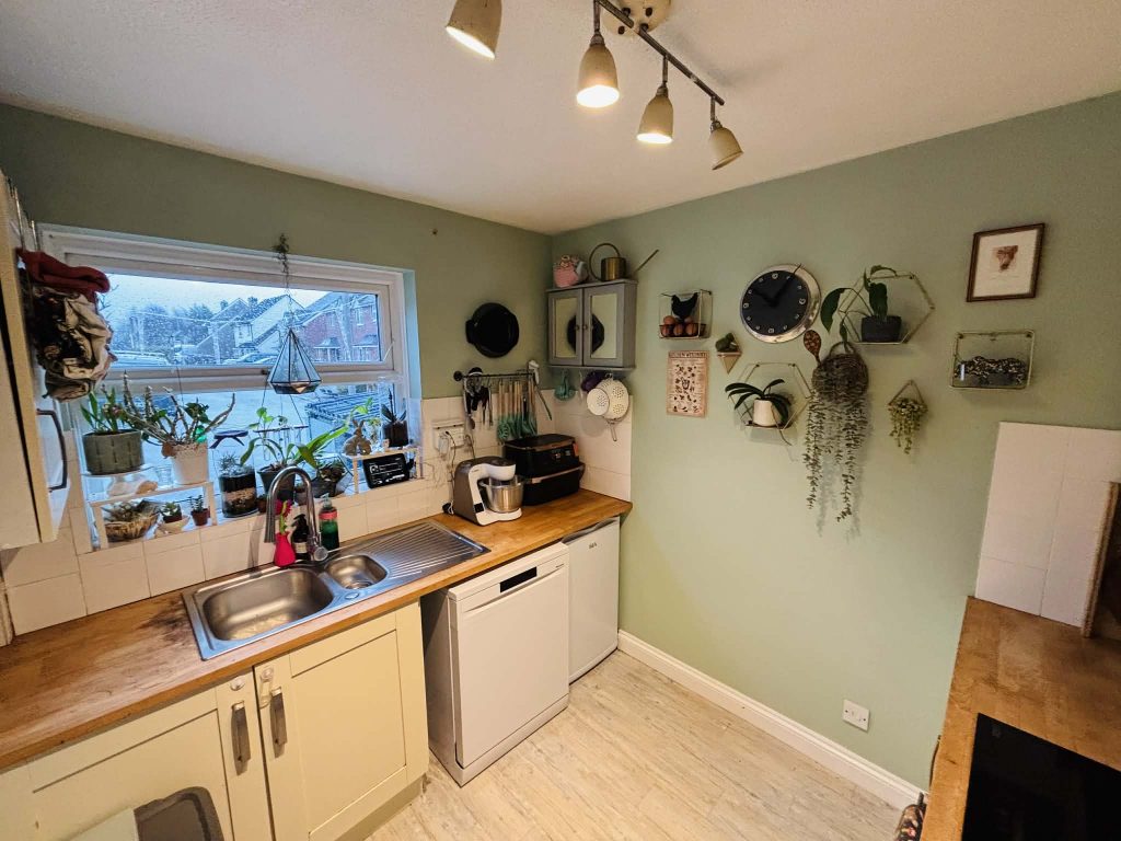 Laminate faced units with worktops comprising 1 ½ bowl single drainer stainless steel sink unit with mixer tap set in worktop with fitted cupboards under. Appliance space with plumbing for dishwasher. Further appliance space. Worktop with four ring ceramic hob inset with built in oven under and range of eye level wall units.