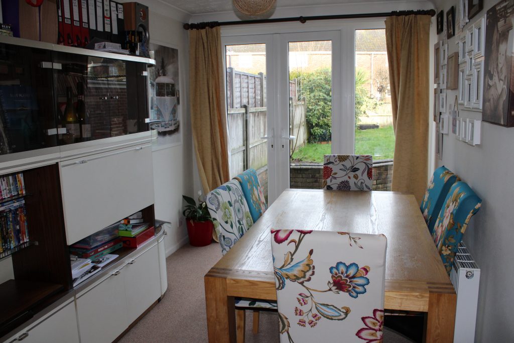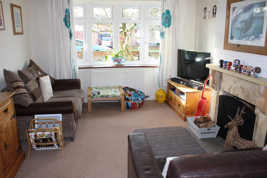 Most attractive dual aspect living room with sealed double glazed bay window to front and casement doors to rear garden. Open fireplace with tiled hearth and tiled surround. Radiator. Power points.