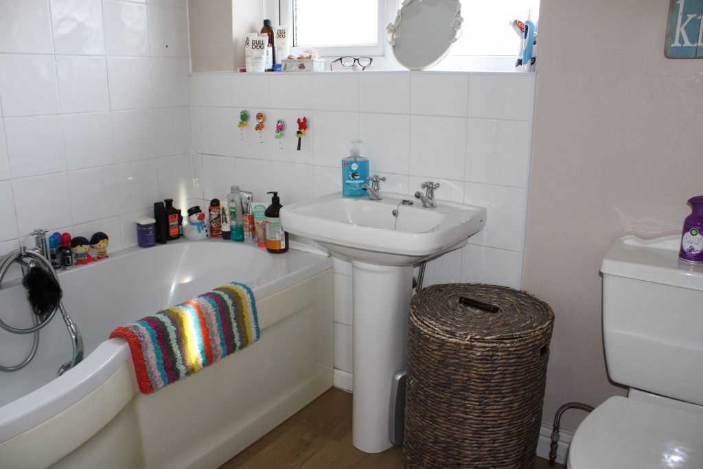 Three piece white suite comprising P panelled bath with mixer tap and shower attachment with concave folding shower door adjacent. Pedestal wash hand basin. Low level WC. Ladder effect heated towel rail. Wood laminate flooring. Frosted double glazed windows to rear. Extractor fan.