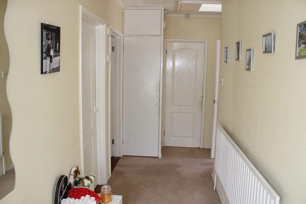 Attractive dual aspect room with sealed double glazed windows to front and side. Fireplace with polished stone surround. Power points. Radiators. Airing cupboard with lagged tank and immersion. Coats cupboard.