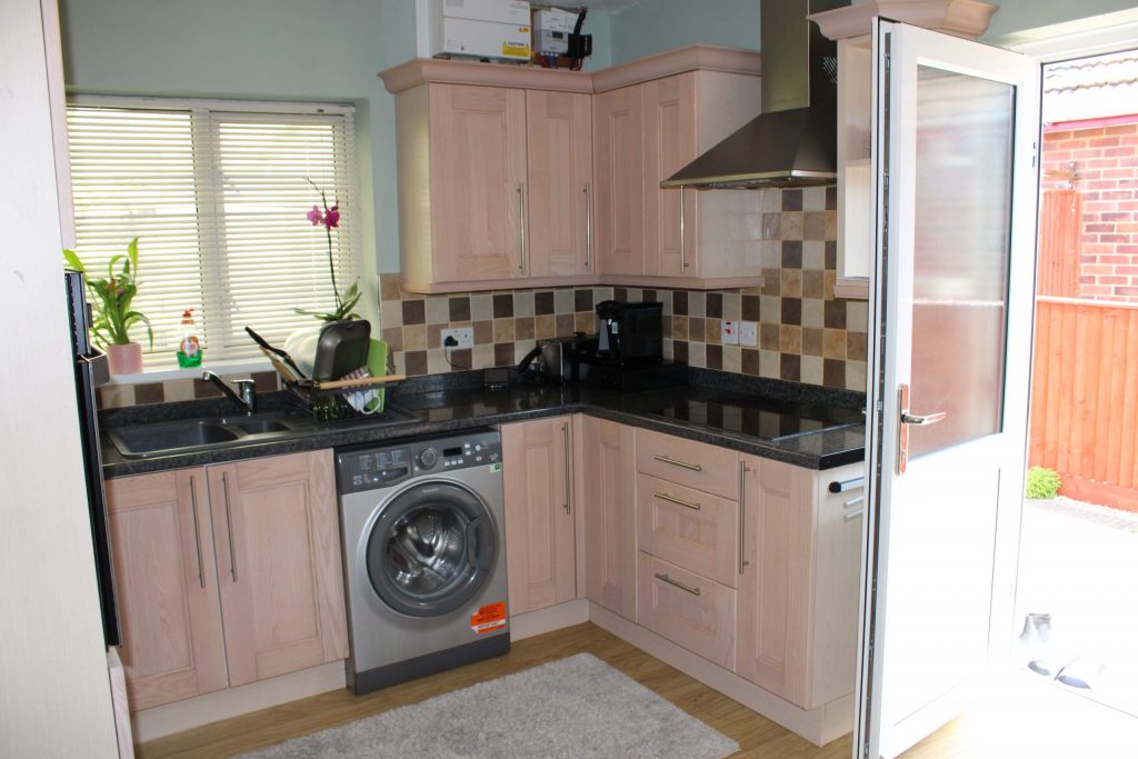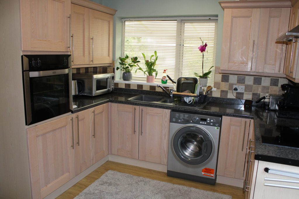 Attractively fitted with limed oak faced units with rolled edge worktops above comprising 1 ½ bowl single drainer sink unit with mixer tap set in worktop with fitted cupboards under. Appliance space with plumbing for washing machine. Further housing with Belling built in oven. Ceramic hob with extractor hood above. Further range of base and eye level wall units. Part tiled walls. Wall mounted gas boiler for central heating and domestic hot water. Radiator.