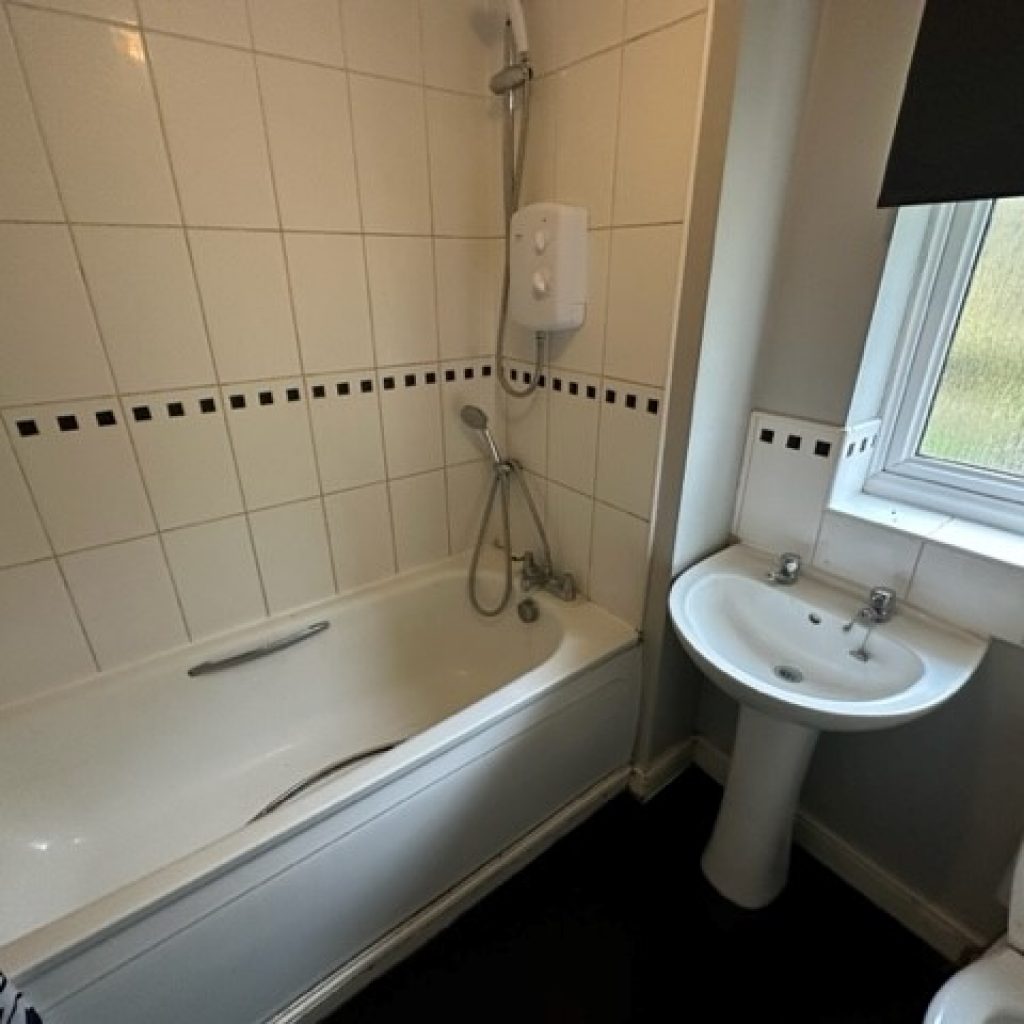Three piece suite comprising panelled bath with mixer tap and shower attachment with separate Triton electric shower unit above. Pedestal wash hand basin. Low level WC. Frosted double glazed windows to rear. Part tiled walls. Extractor fan. Radiator.