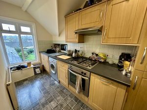 Attractively fitted with laminate faced units and rolled edge worktops comprising single drainer stainless steel sink unit with mixer tap set in worktop with fitted cupboards under. Appliance space with plumbing for washing machine. Further work surface with four ring gas hob inset with extractor hood above and built in oven under with slimline dishwasher adjacent. Fully integrated fridge/freezer. Radiator.