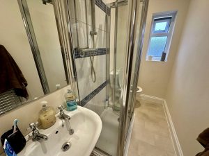 Shower cubicle with thermostatically controlled shower unit in situ. Pedestal wash hand basin. Low level WC. Extractor fan. Frosted double glazed window to rear. Recessed downlighters. Recessed storage cupboard.