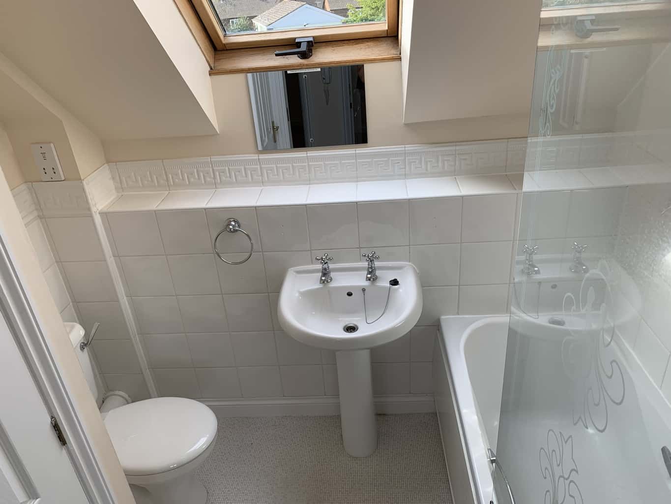 Three piece suite comprising panelled bath with separate thermostatically controlled shower unit above. Pedestal wash hand basin. Low level WC. Part tiled walls. Velux double glazed skylight window. Shaver point. Airing cupboard with lagged tank.