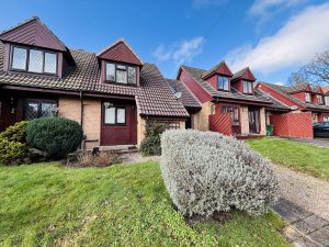 To the front of the property is an open plan with grassed area and also driveway leading to garage.