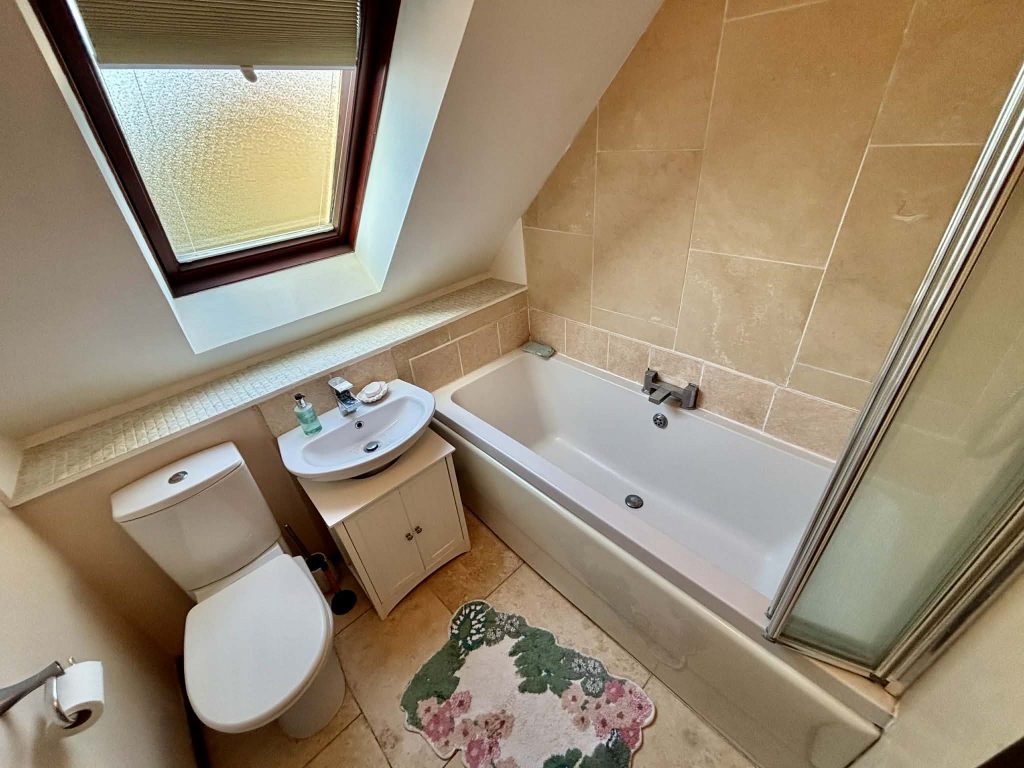 Three piece suite comprising panelled bath with mixer tap and separate thermostatically controlled shower unit above with glazed shower door adjacent. Wash hand basin with waterfall mixer tap. Low level WC. Ceramic tiled flooring. Frosted double glazed velux skylight window to rear.