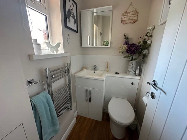 Low level WC. Wash hand basin with mixer tap with storage cupboard under. Ladder effect heated towel rail. Frosted double glazed window to front. Laminate flooring. Door to