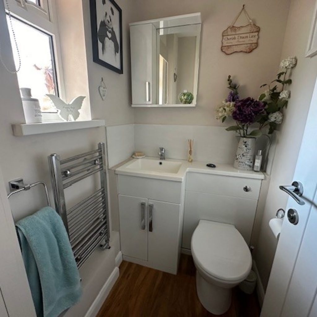 Low level WC. Wash hand basin with mixer tap with storage cupboard under. Ladder effect heated towel rail. Frosted double glazed window to front. Laminate flooring. Door to