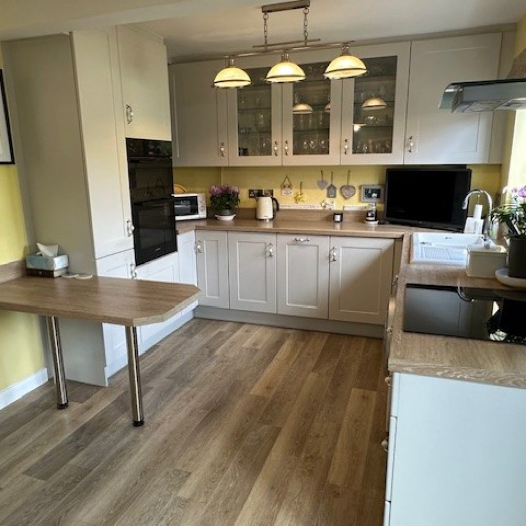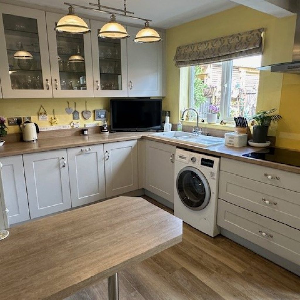 Attractively refitted with laminate faced units and rolled edge worktops comprising 1 ½ bowl single drainer enamel sink unit incorporating waste disposal also set in worktop with fitted cupboards under. Four ring ceramic hob inset with extractor hood above. Double built in oven. Comprehensive range of base and eye level wall units. Breakfast bar. Laminate flooring. Sealed double glazed windows to rear and casement doors to rear garden.