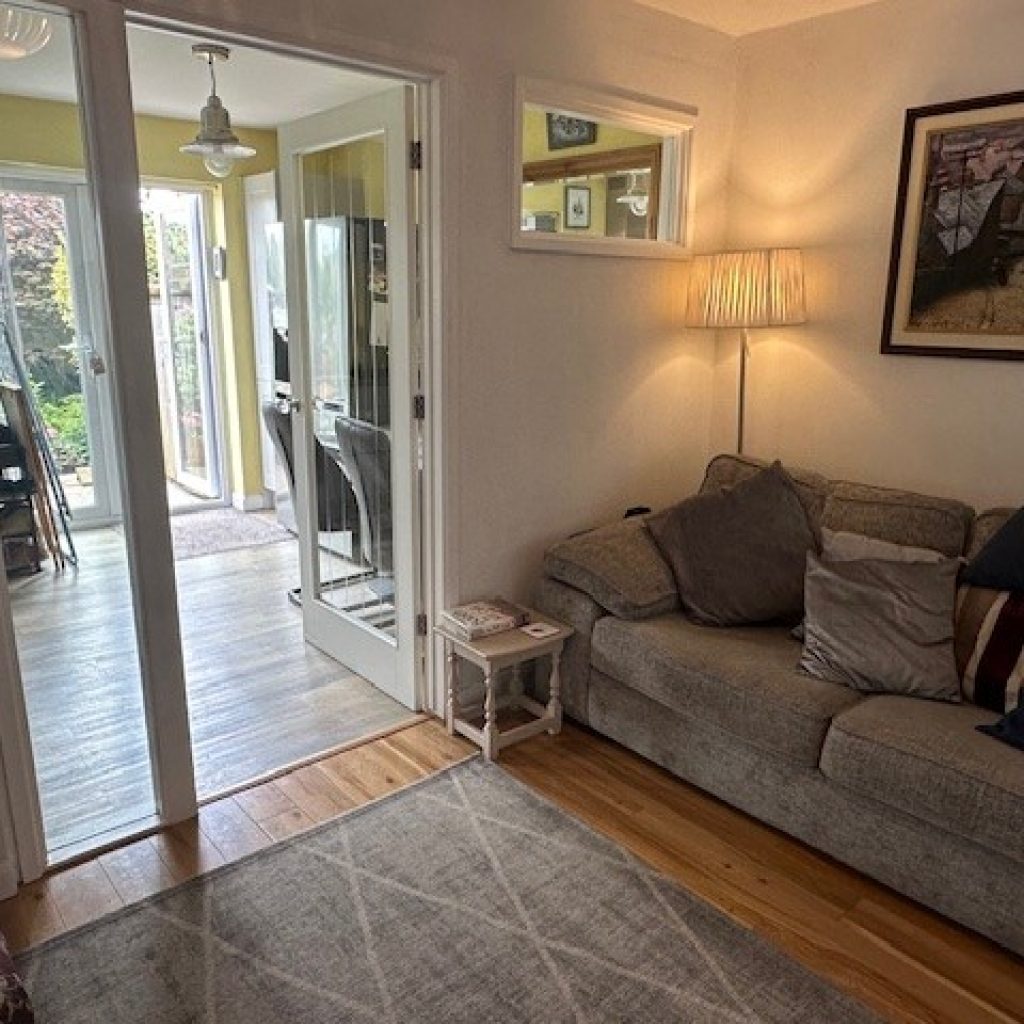 Most attractive L shaped living room with laminate flooring. Radiator. Attractive skylight window to front and double glazed window to side. Door to