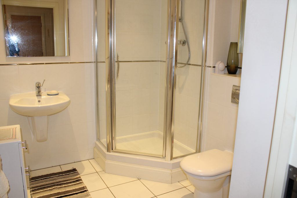 Shower cubicle with thermostatically controlled shower unit in situ. Low level WC. Wash hand basin with mixer tap. Ceramic tiled flooring with underfloor heating.