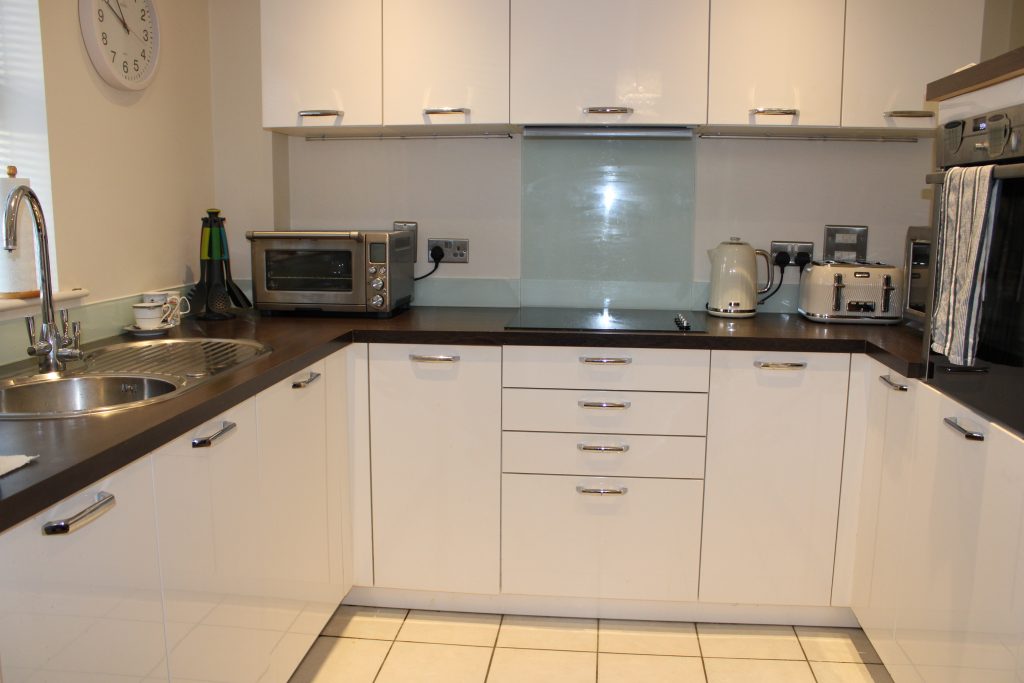 Attractively fitted with white laminate faced units and worktops above comprising single drainer sink unit set in worktop with fitted cupboards under also with fully integrated built in dishwasher adjacent is a cupboard housing water softener. Integrated fridge/freezer. Ceramic hob set in worktop. Built in eye level oven. Further range of base and eye level wall units with under unit lighting. Downlighters. Sealed double glazed windows to front.