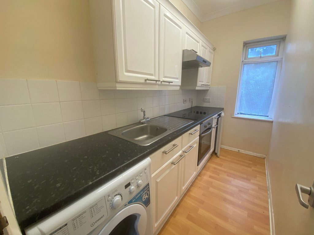 Laminate faced units with rolled edge worktops. Single drainer sink unit with mixer tap and storage cupboard under. Appliance space and plumbing for washing machine. Ceramic hob with built in electric oven under.