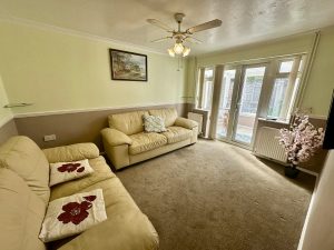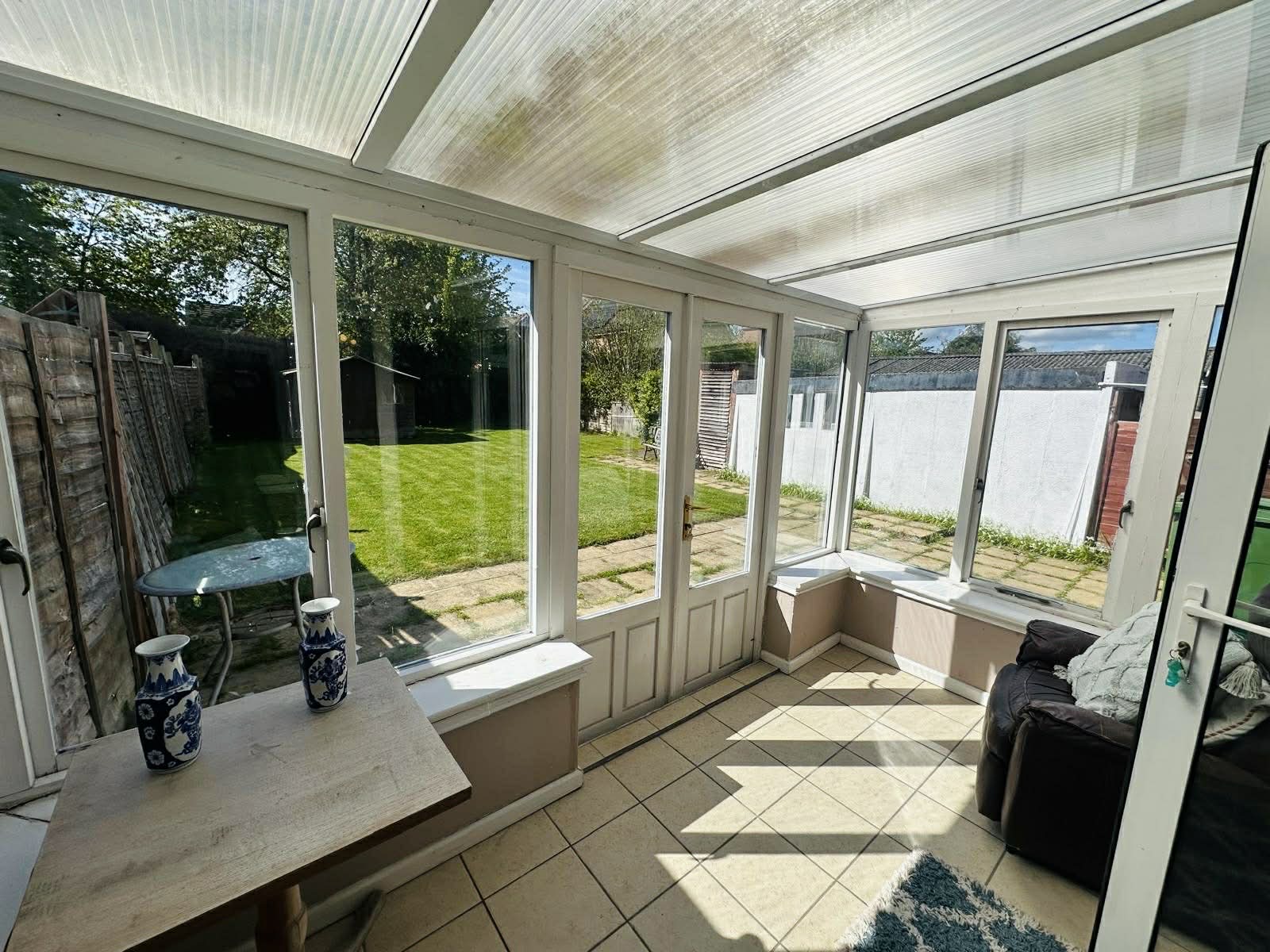Part brick and wood framed conservatory with thermoplastic roof line. Ceramic tiled flooring. Double glazed casement doors to rear garden.