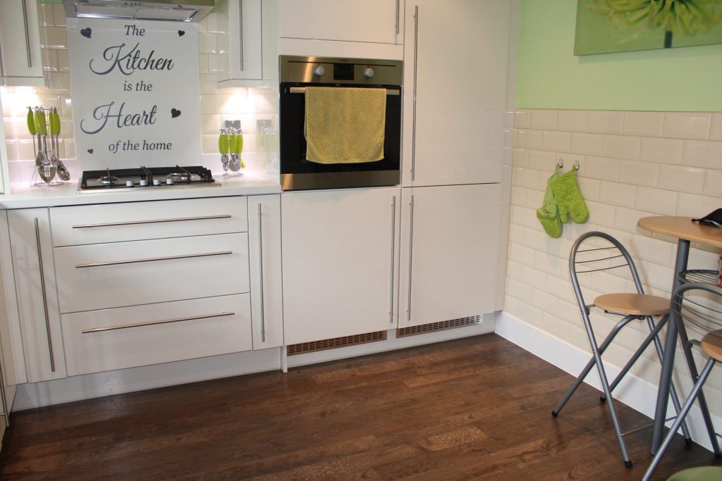 Attractively fitted with laminate faced units and rolled edge worktops comprising 1 1/2 bowl single drainer sink unit with mixer tap set in worktop with fitted cupboards under also integrated dishwasher. Further work surface with four ring gas hob inset with stainless steel extractor hood above. Adjacent is built in oven. Fully integrated fridge and freezer. Cupboard housing Baxi gas boiler for central heating and domestic hot water. Sealed double glazed windows to front. Radiator. Part tiled walls. Downlighters. Extractor fan.