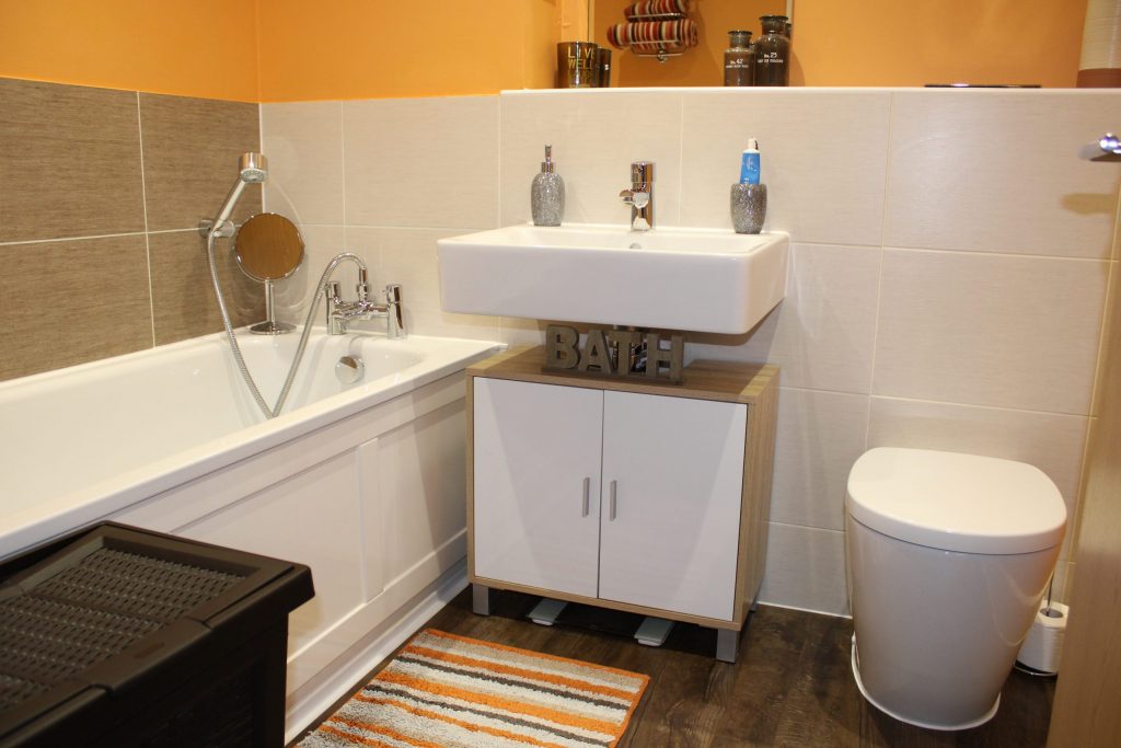 Two piece suite comprising wash hand basin with mixer tap and tiled surround. Low level WC. Frosted double glazed window to side. Radiator. Recessed downlighters. Extractor fan. Laminate flooring.