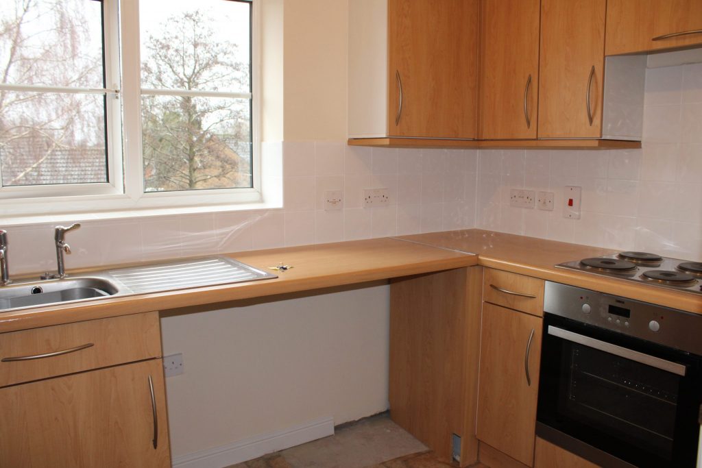 Laminate faced units with rolled edge worktops comprising single drainer sink unit set in worktop with fitted cupboards under also appliance space for dishwasher and washing machine. Further work surface with four ring electric hob inset with built in oven under and concealed extractor hood above. Range of base and eye level wall units. Sealed double glazed windows to rear. Part tiled walls.