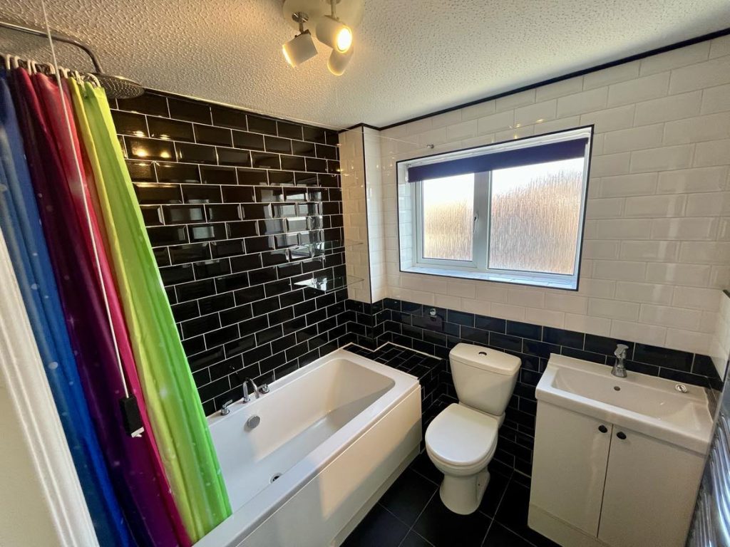 Attractively refitted with three piece suite comprising panelled bath with central mixer tap and thermostatically controlled multi-head shower unit above part tiled walls. Wash hand basin with mixer tap with storage cupboard under. Low level WC. Ladder effect heated towel rail. Frosted double glazed window to rear.