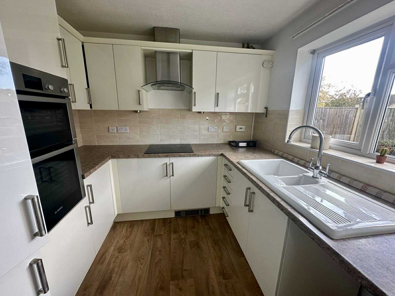 1 ½ bowl single drainer sink unit with mixer tap set in worktop with fitted cupboards and drawer units under. Appliance space. Further work surface with ceramic hob inset with storage cupboards under with multi-purpose extractor hood above. Double built in Bosch oven. Integrated fridge/freezer. Further range of base and eye level wall units. Cupboard housing Worcester gas boiler for central heating and domestic hot water. Power points. Part tiled walls. Sealed double glazed windows to front with views over green.