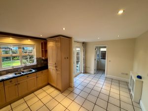 The kitchen area is fitted with laminate faced units and Corian worktops comprising double bowl stainless steel sink unit with mixer tap set in worktop with range of base units incorporating fitted cupboards and drawers. Fully integrated dishwasher and fridge/freezer. Built in double oven with gas hob set in worktop above. Comprehensive range of eye level wall units and display cabinets with concealed lighting. Ceramic tiled flooring. Sealed double glazed windows to rear. Radiator. Casement doors to garden. Door to