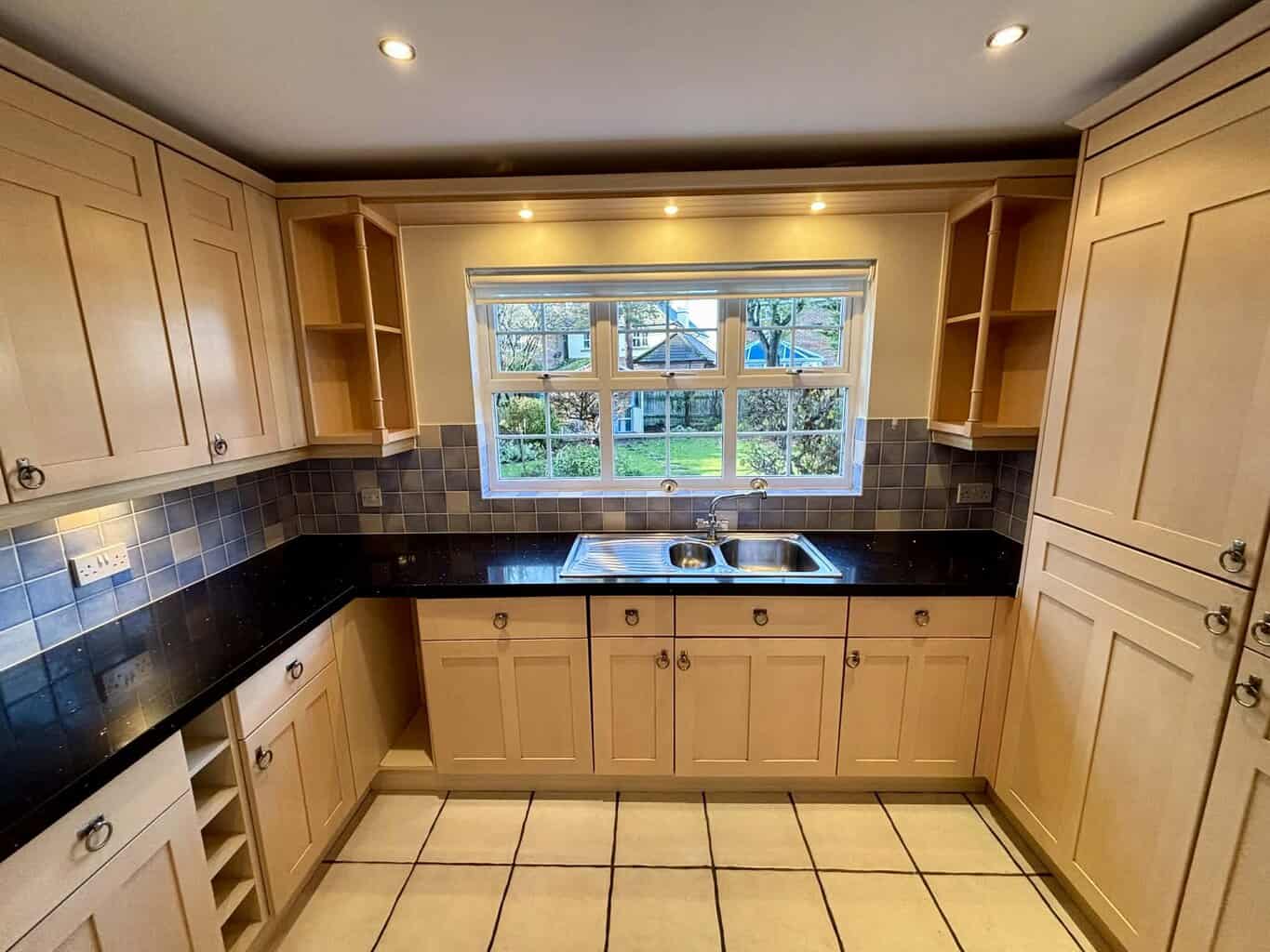 Single drainer stainless steel sink unit with mixer tap set in worktop with storage cupboards under. Appliance space. Further base and eye level wall units. Part tiled walls. Sealed double glazed door to side.