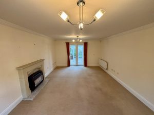 Attractive dual aspect room with sealed double glazed windows to front and casement doors to conservatory. Polished stone fireplace with marble inlay and gas fire in situ. Power points. TV aerial point. Radiators. Double doors to