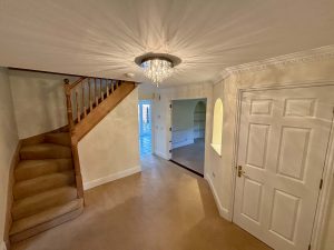 Radiator. Power points. Recessed storage cupboard under stairs with lighting.