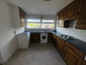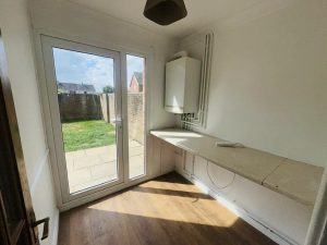 Rolled edge worktop with appliance space under. Wall mounted gas boiler for central heating and domestic hot water. Sealed double glazed UPVC door and side panel giving access to rear garden. Laminate flooring.