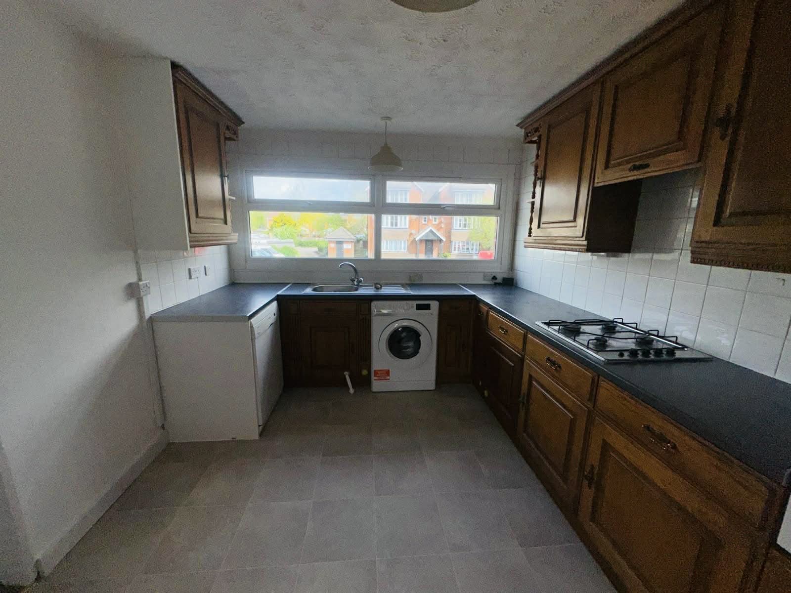 Wood faced units with rolled edge worktops comprising single drainer sink unit with mixer tap set in worktop with fitted cupboards under. Appliance space with plumbing for washing machine and dishwasher. Further work surface with four ring gas hob inset with built in oven. Further range of base and eye level wall units. Part tiled walls. Sealed double glazed windows to front.