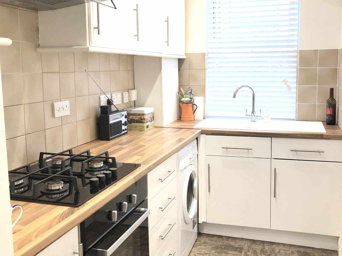 Laminate faced units with rolled edge worktops comprising 1 ½ bowl single drainer sink unit with mixer tap set in worktop with fitted cupboards under. Further work surface with four ring gas hob inset with built in oven under. Appliance space with plumbing for washing machine. Range of eye level wall units. Radiator. Sealed double glazed windows to front. Recessed downlighters.