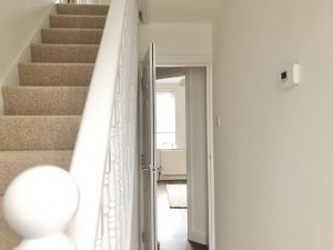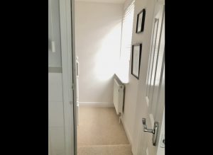 Recessed storage cupboard with hanging rail. Entry phone system. Laminate flooring.