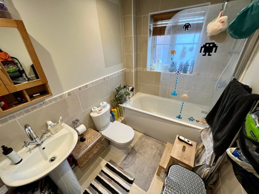 Three piece suite comprising panelled bath with mixer tap with thermostatically controlled shower unit above with glazed shower door adjacent. Low level WC. Pedestal wash hand basin with mixer tap. Part tiled walls. Extractor fan. Recessed downlighters. Frosted double glazed windows to rear. Ceramic tiled flooring.