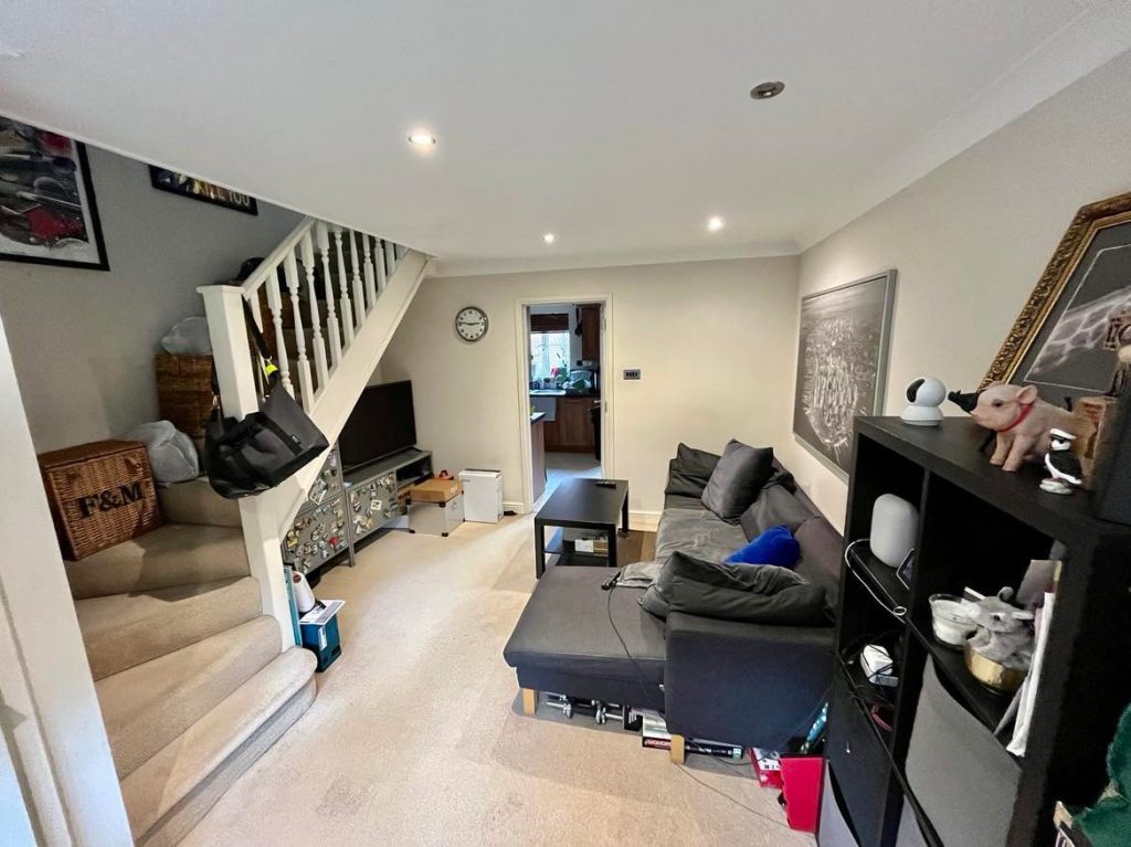 Staircase from living room gives access to