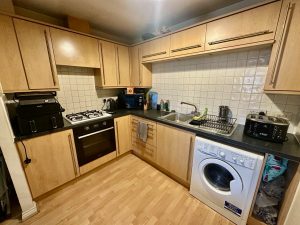 Sealed double glazed windows to front. Radiator. Laminate flooring. Kitchen area with 1 ½ bowl single drainer sink unit with mixer tap set in worktop with fitted cupboards under. Appliance space with plumbing for washing machine. Further work surface with four ring gas hob inset with built in oven under and extractor hood above. Further range of base and eye level wall units. Part tiled walls.