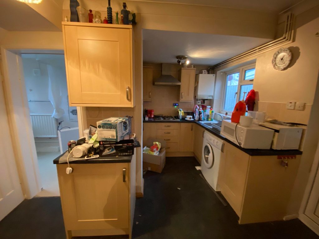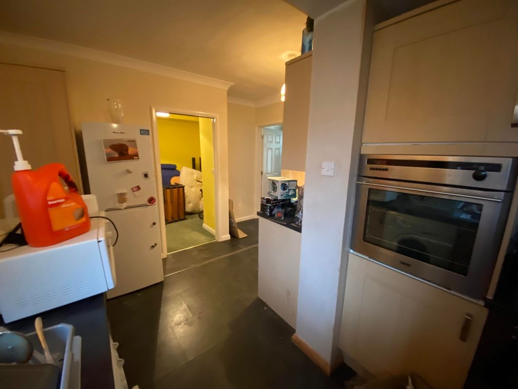 Laminate faced units comprising single drainer stainless steel sink unit with mixer tap set in worktop with fitted cupboard under also appliance space with plumbing for washing machine. Further work surface with four ring gas hob inset with built in extractor hood above. Built in oven. Range of base and eye level wall units. Wall mounted gas boiler for central heating and domestic hot water. Recessed storage cupboard with fitted shelving. Sliding door to