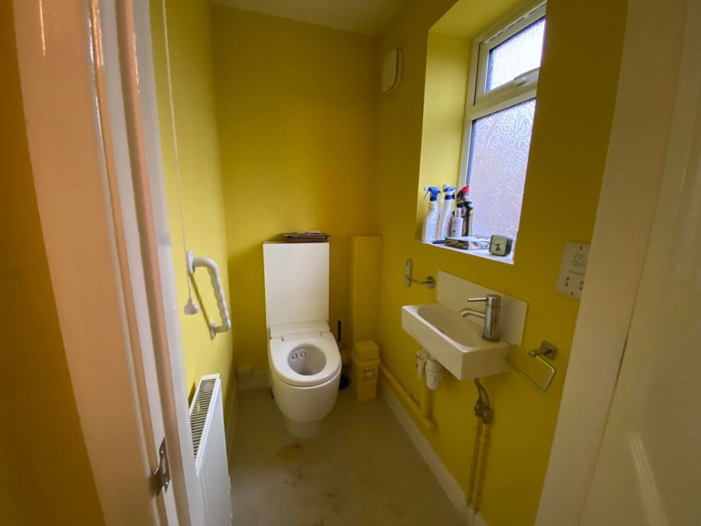 Comprising low level WC. Wash hand basin with mixer tap. Sealed double glazed frosted window to rear. Sealed double glazed door to garden.