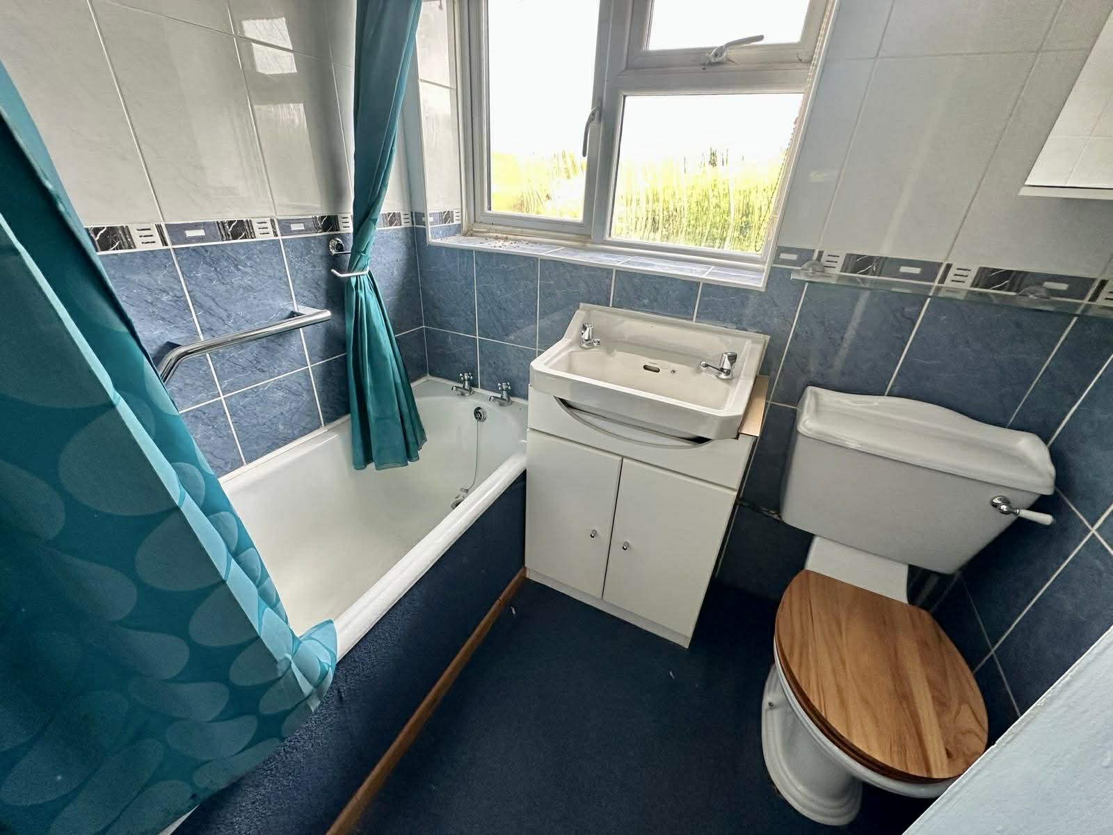 Panelled bath with separate thermostatically controlled shower unit above. Wash hand basin with storage under. Low level WC. Frosted double glazed windows to rear.
