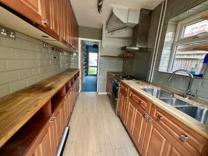 Wood faced units with worktops above comprising triple bowl stainless steel sink unit set in worktop with mixer tap. Gas and electric cooker points. Range of base and eye level wall units. Sealed double glazed windows to side. Fully tiled walls.