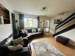 Laminate flooring. Radiators. Sealed double glazed windows to front. Recess with shelving. Storage cupboard under open plan staircase. Door to