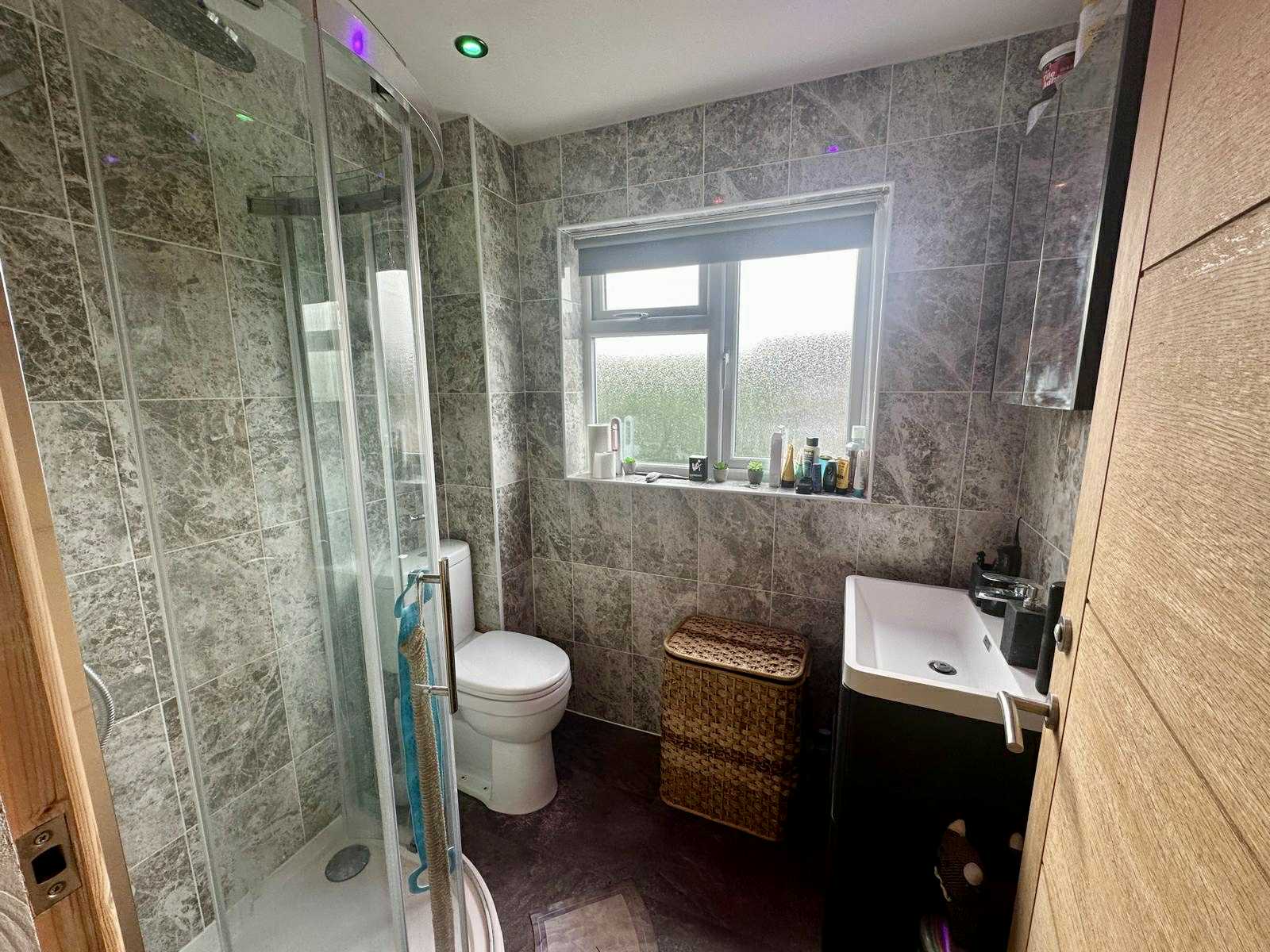 Corner shower cubicle with thermostatically controlled shower unit in situ. Wash hand basin with mixer tap with storage cupboard under. Low level WC. Fully tiled walls. Recessed downlighters. Frosted double glazed window to rear.