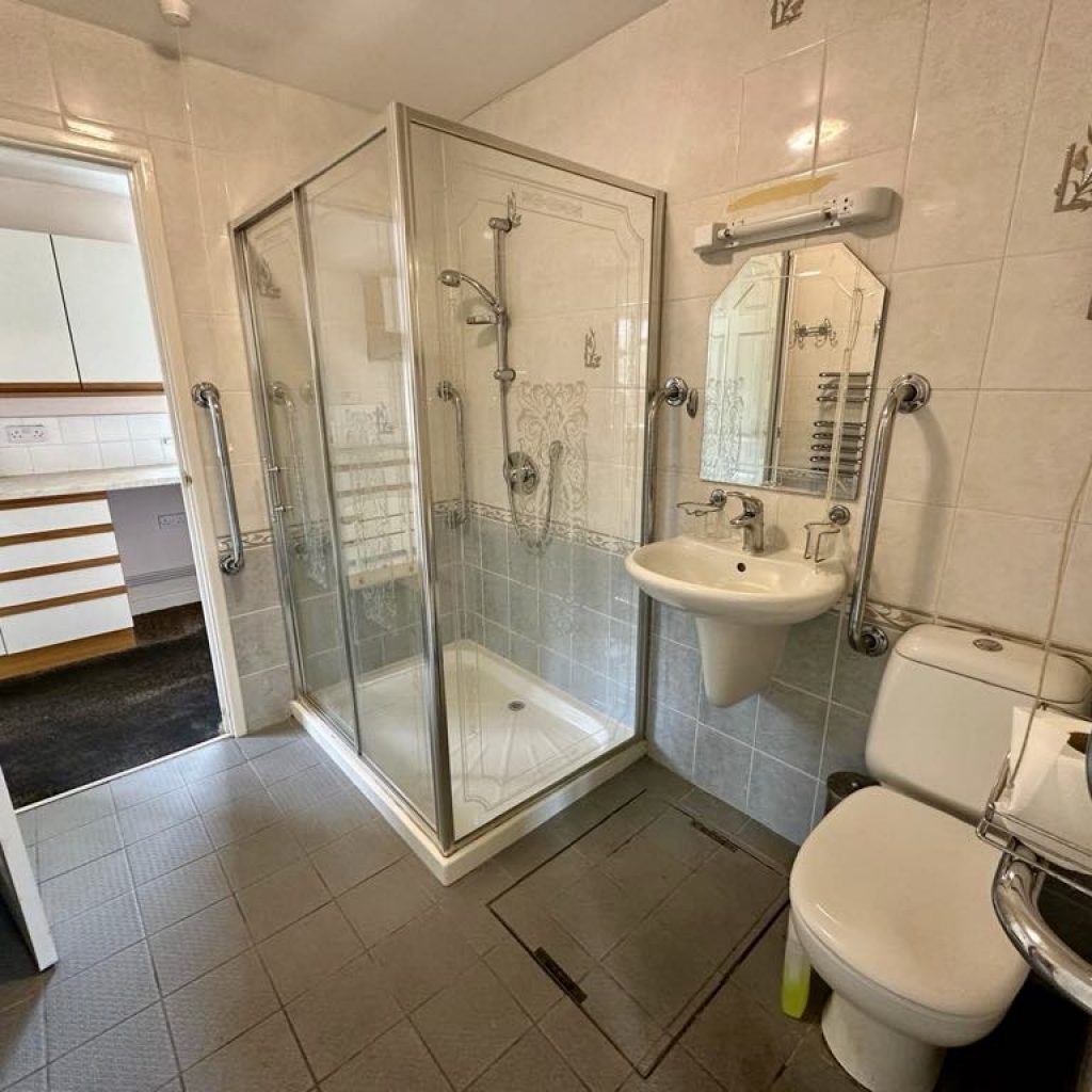 Twin sized corner shower cubicle with thermostatically controlled shower unit in situ. Wash hand basin with mixer tap. Low level WC. Wall mounted electric towel rail. Striplight. Extractor fan.