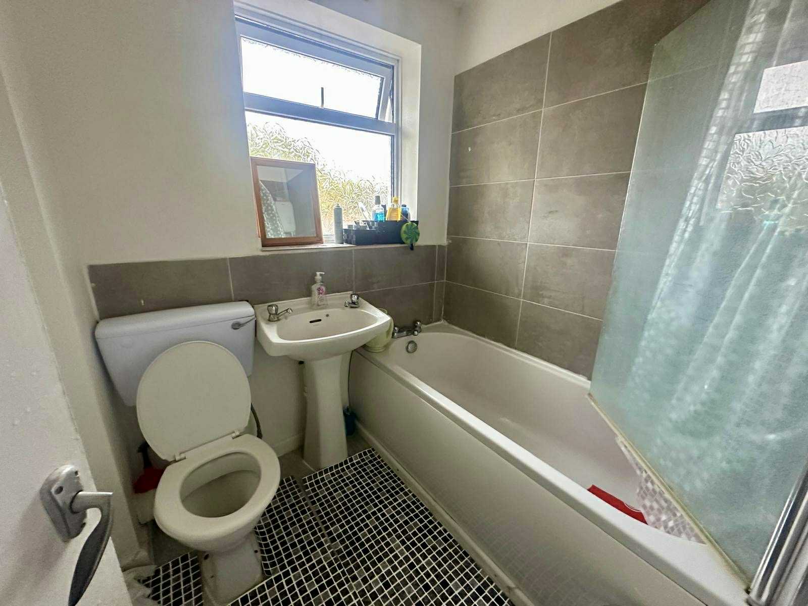Three piece suite comprising panelled bath with mixer tap and separate shower unit above with glazed shower door. Pedestal wash hand basin. Low level WC. Frosted double glazed window to rear. Extractor fan. Radiator.
