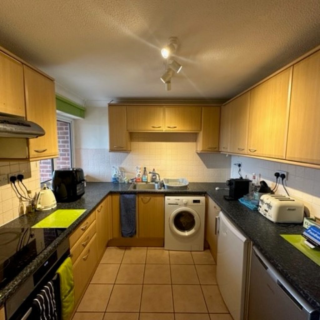 Laminate faced units with rolled edge worktops comprising single drainer sink unit with mixer tap set in worktop with fitted cupboards under. Appliance space with plumbing for washing machine. Further work surface with appliance space under. Four ring ceramic hob set in worktop with built in oven under. Further range of base and eye level wall units. Ceramic tiled flooring.