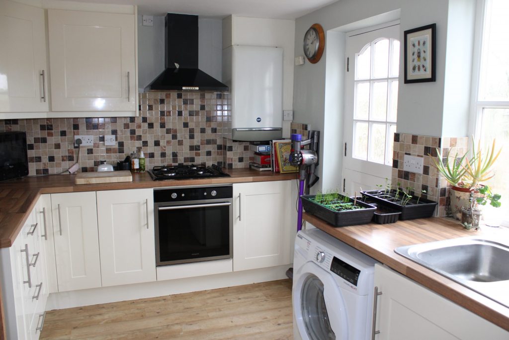 Most attractive laminate faced units with rolled edge worktops comprising 1 ½ bowl single drainer sink unit set in worktop with fitted cupboards under. Plumbing for washing machine and dishwasher. Further range of base units and eye level wall units. Four ring gas hob set in worktop with built in oven under and extractor hood above. Stable door to rear with far reaching views across open farmland. Radiator.