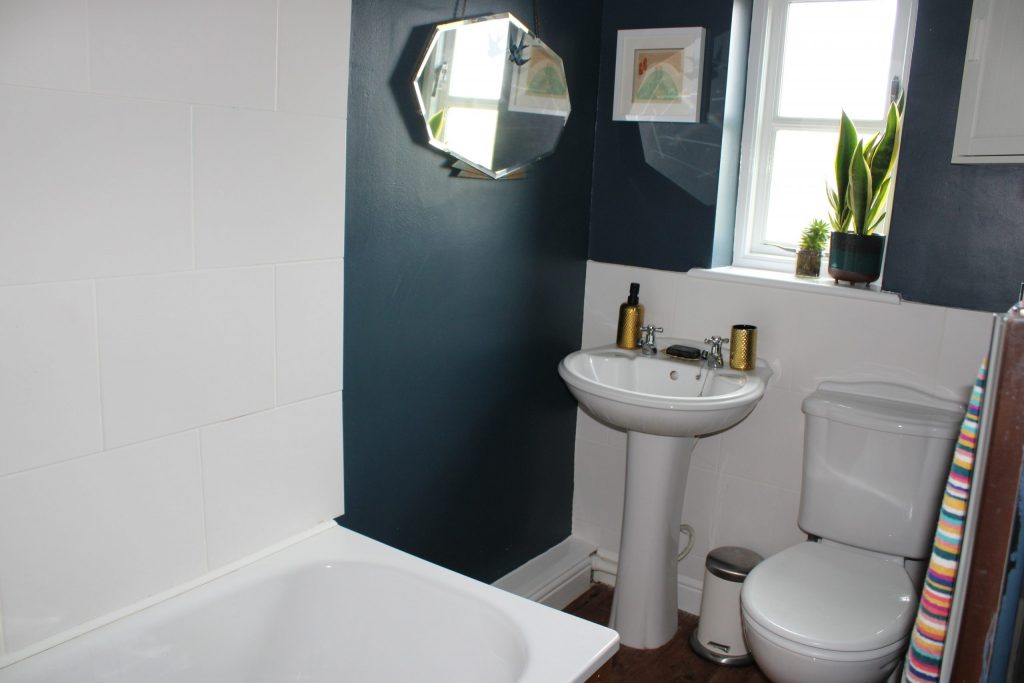 Panelled bath with mixer tap and shower attachment. Pedestal wash hand basin. Low level WC. Part tiled walls. Ladder effect heated towel rail. Frosted glazed windows to rear.