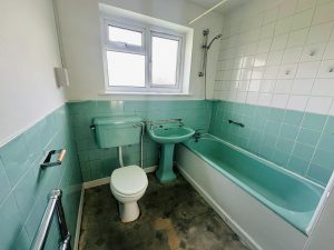 Three piece suite comprising panelled bath with mixer tap and hand shower attachment. Pedestal wash hand basin. Low level WC. Heated towel rail. Linen cupboard with radiator inset with range of slatted shelving.